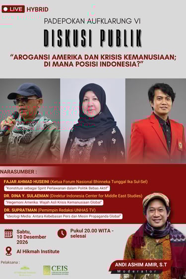 Entering the third week of the Padepokan Aufklärung VI program, Al Hikmah Institute Makassar, in collaboration with the Center for Eastern Indonesian Studies (CEIS), once again held a public discussion on Saturday, January 10, 2026. The discussion carried the theme “American Arrogance and the Humanitarian Crisis: Where Does Indonesia Stand?”